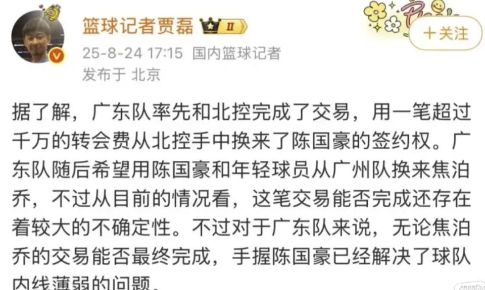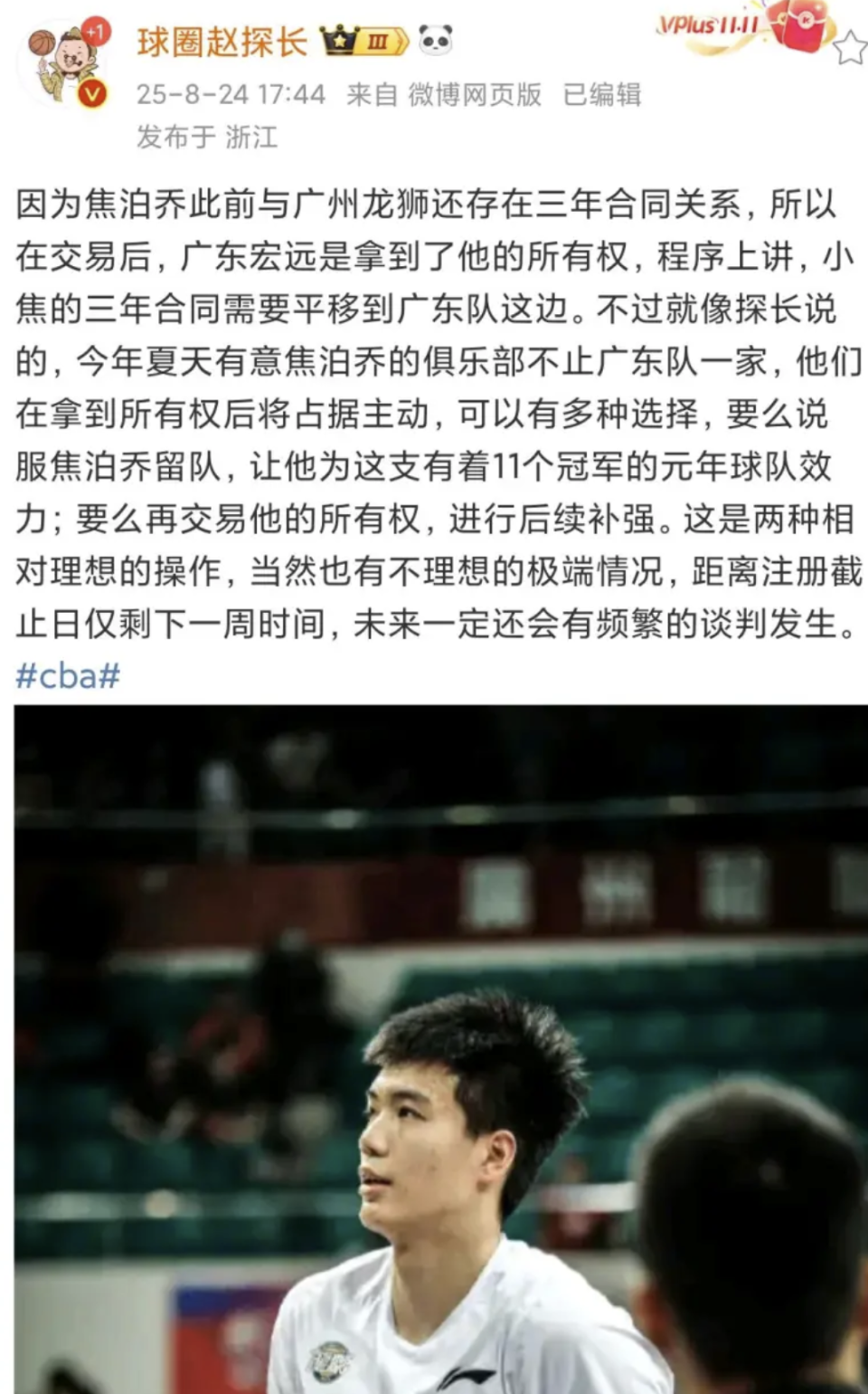 接下来还有更疯狂的操作,后面有CBA记者跟进爆料,他们现在准备用陈国豪再加上两位年轻人,换来广州队的焦泊乔,这两个人不出意外是广东的夏振锋+黄明依。那么如果真的是这样的话,等于说广东用了4个人加上一大笔钱,5换1换来了焦泊乔,你就说这个操作是不是感觉很疯狂了?