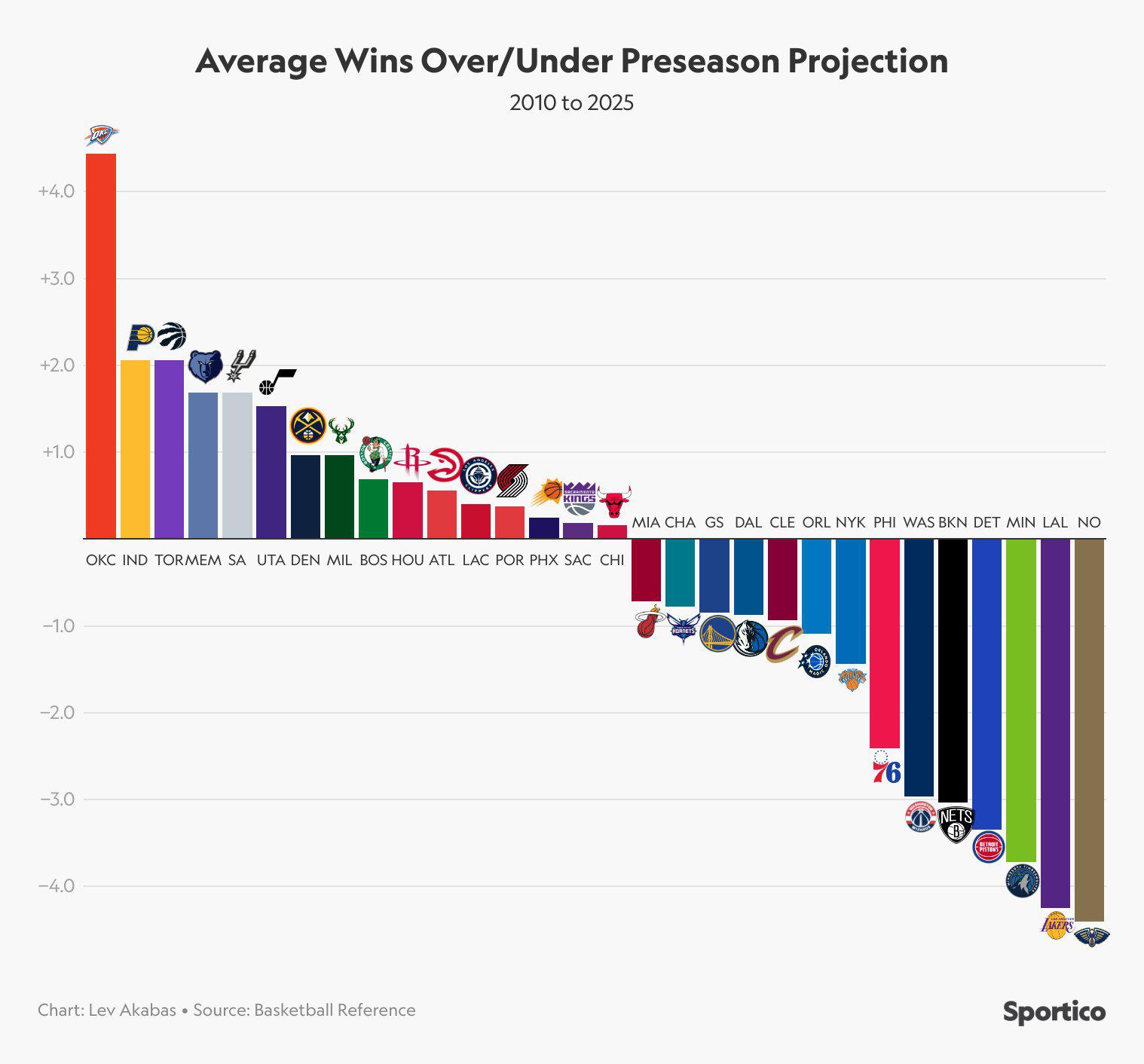 sportico统计了2010-25赛季期间,NBA各支球队超出或者低于赛季前预测的平均战绩场次。
